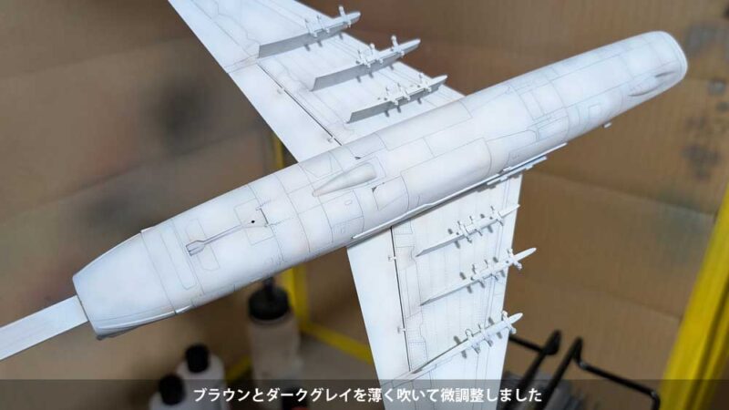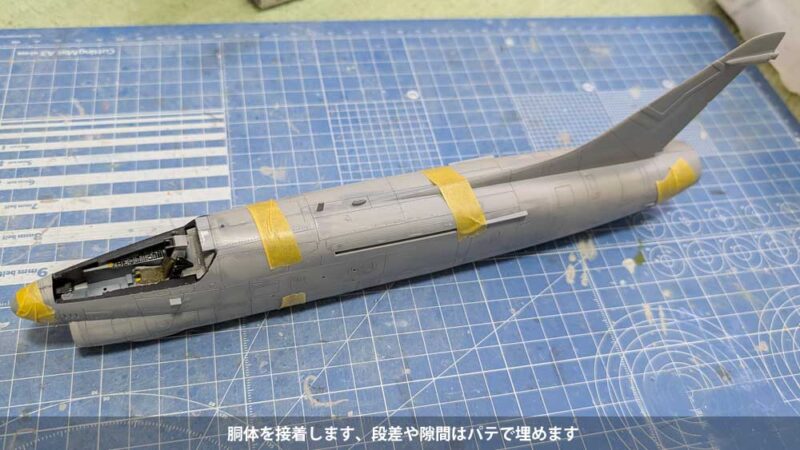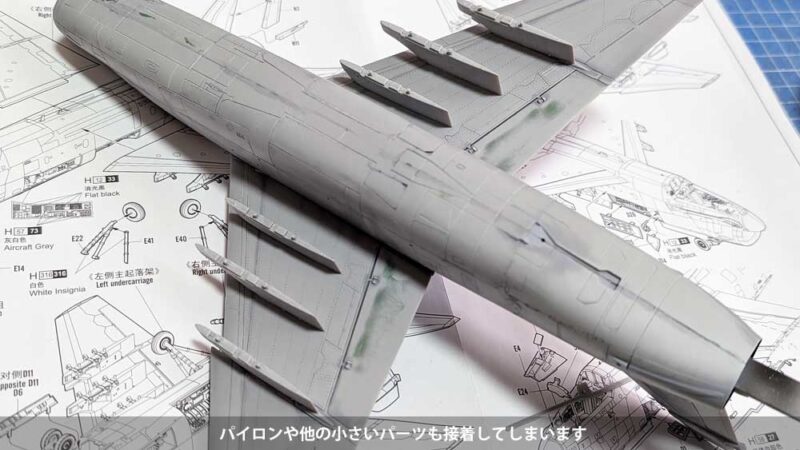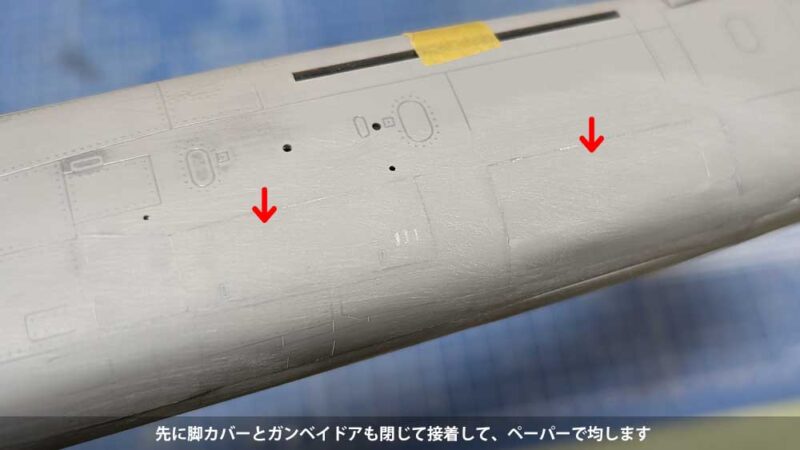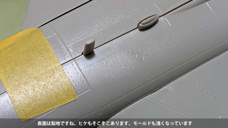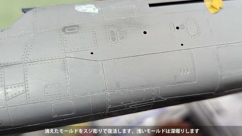 接着した脚カバーなどはペーパーで均し、消えたモールドはスジ彫りして復活させます。