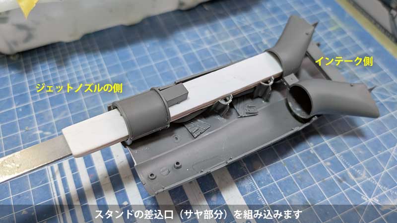胴体パーツ部分に、プラ板で作ったスタンドの受け部分を組み込みます。