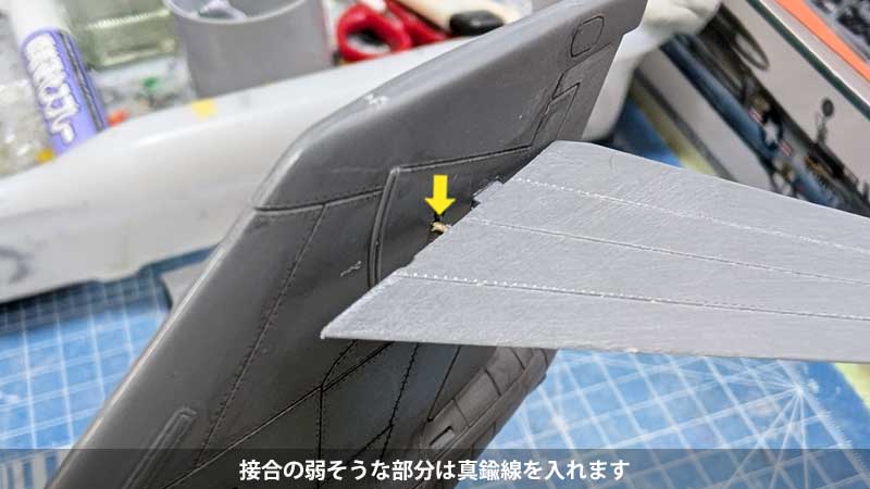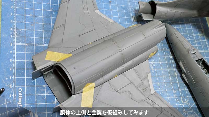 機体上部パーツや、主翼を仮組して干渉部分がないか確認します。