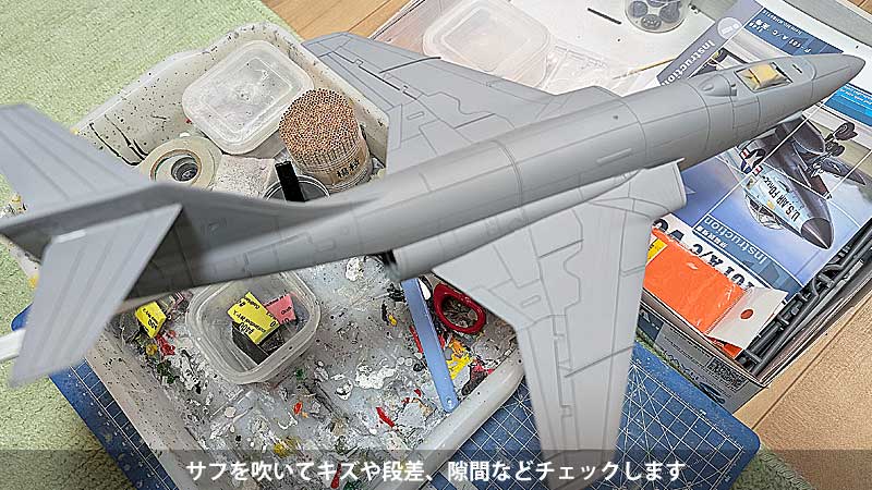 組み上がったら水性のサーフェイサーを吹いてキズや段差、隙間のチェックをします。
