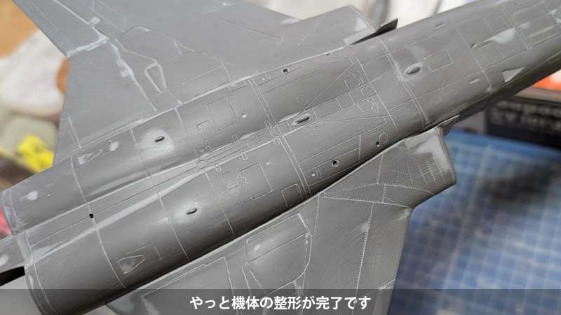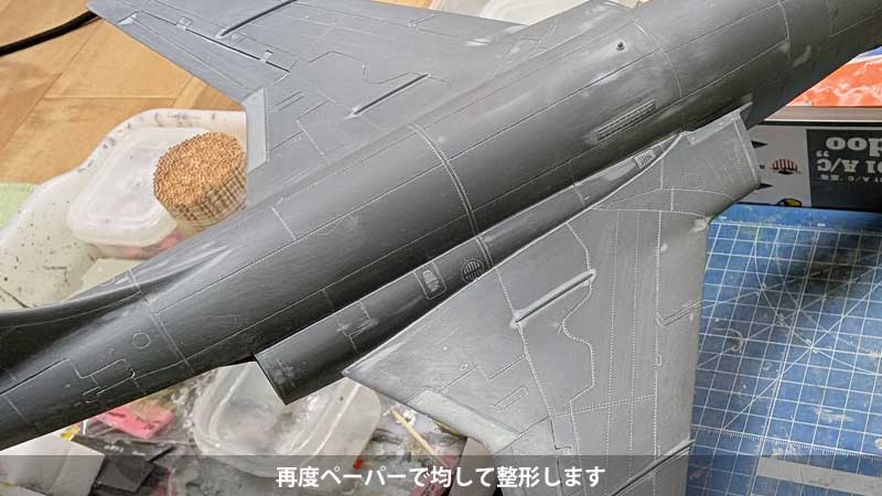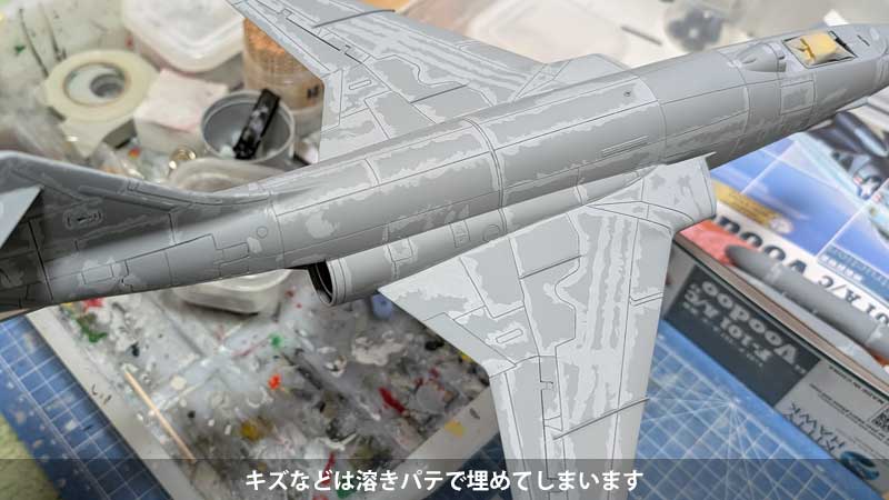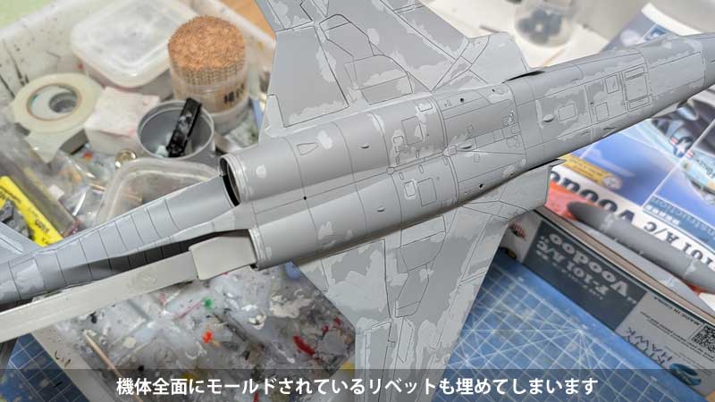 機体全面にモールドされたリベットは少しうるさいので、溶きパテで全部埋めてしまいます。