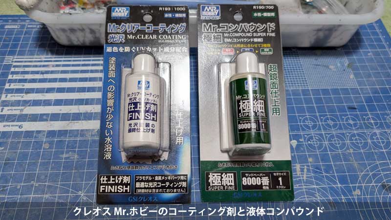 仕方がないので、今回はMrホビーの「Mrコンパウンド極細(液体)」と「Mrクリアコーティング」を使ってみました。