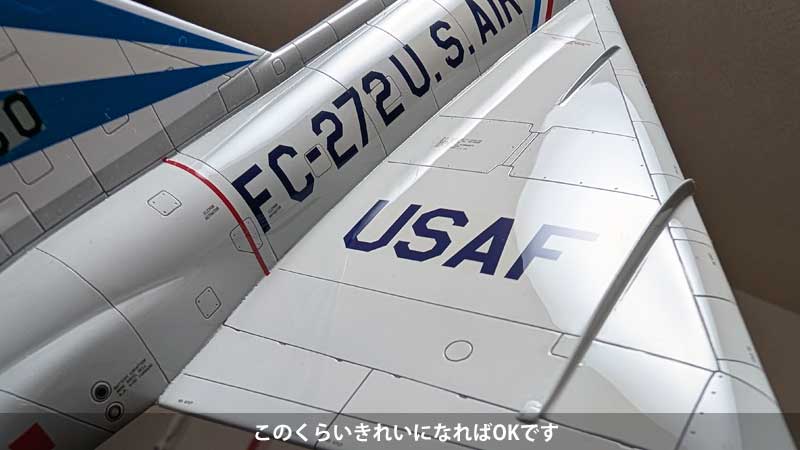 完全に塗りつぶしたつもりでいたのですが失敗です。垂直尾翼は塗りつぶさずに剥がしてから再塗装してので問題なしです。
