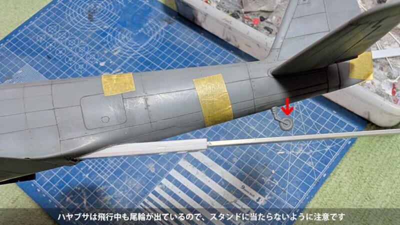 ハヤブサは飛行状態でも尾輪が出ていますので、スタンドが尾輪に干渉しないように注意します。